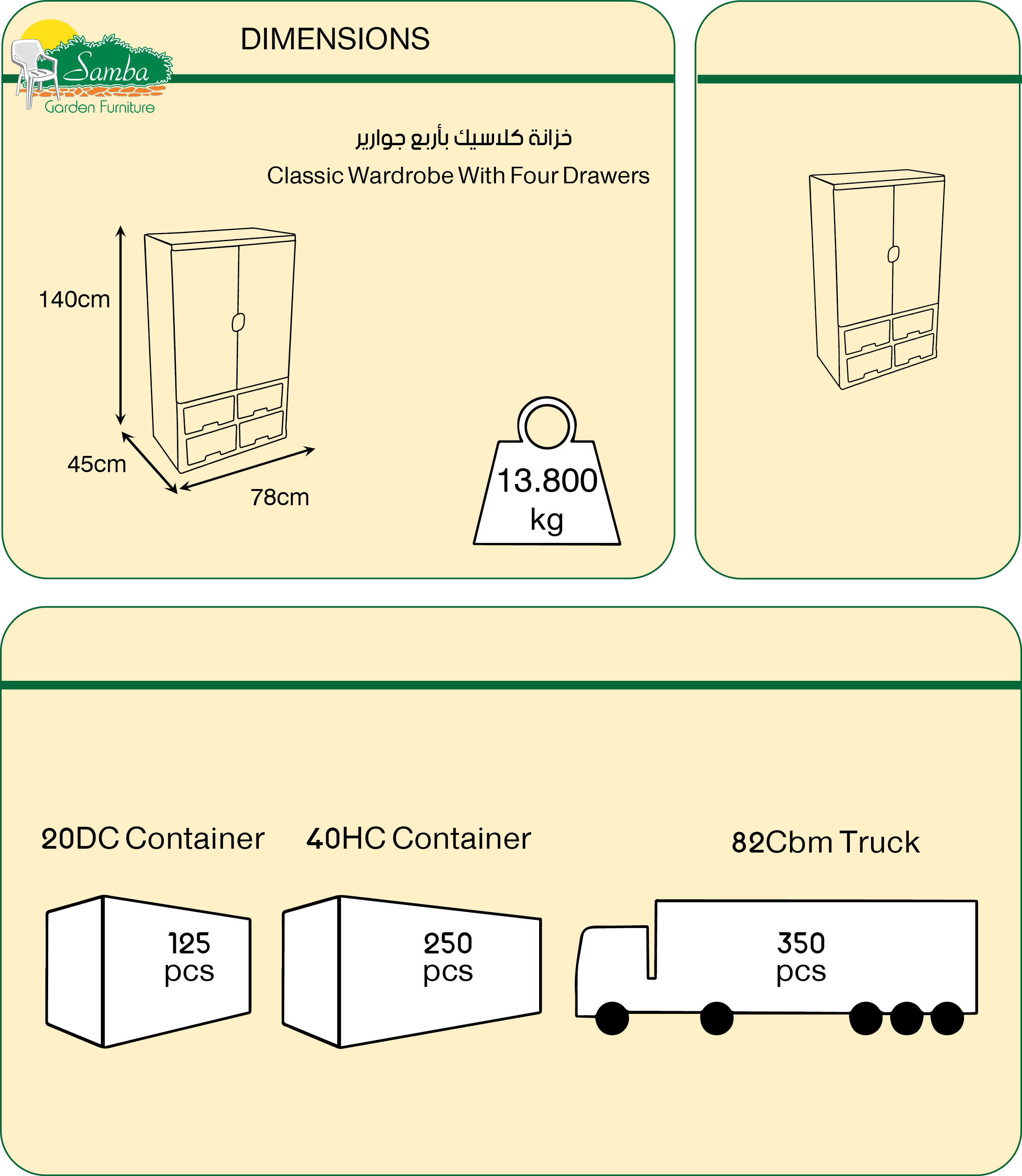 - Wardrobe with two doors, three shelves and FOUR drawers